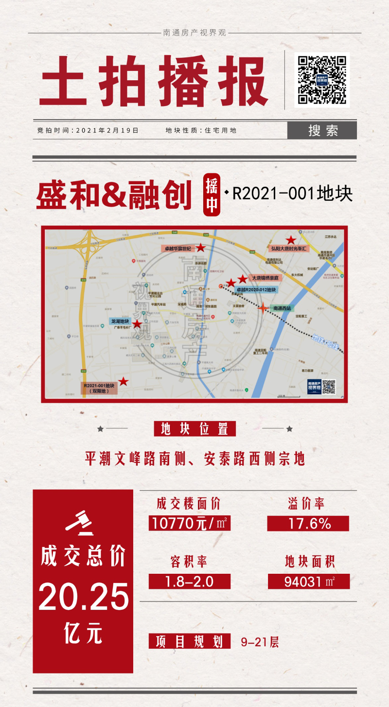 2月19日,平潮高鐵新城“雙限”R2021-001地塊搖號結果正式出爐,盛和房產(chǎn)攜手上海融創(chuàng)以總價20.25億元(成交樓面價10770元/㎡)摘得R2021-001地塊。